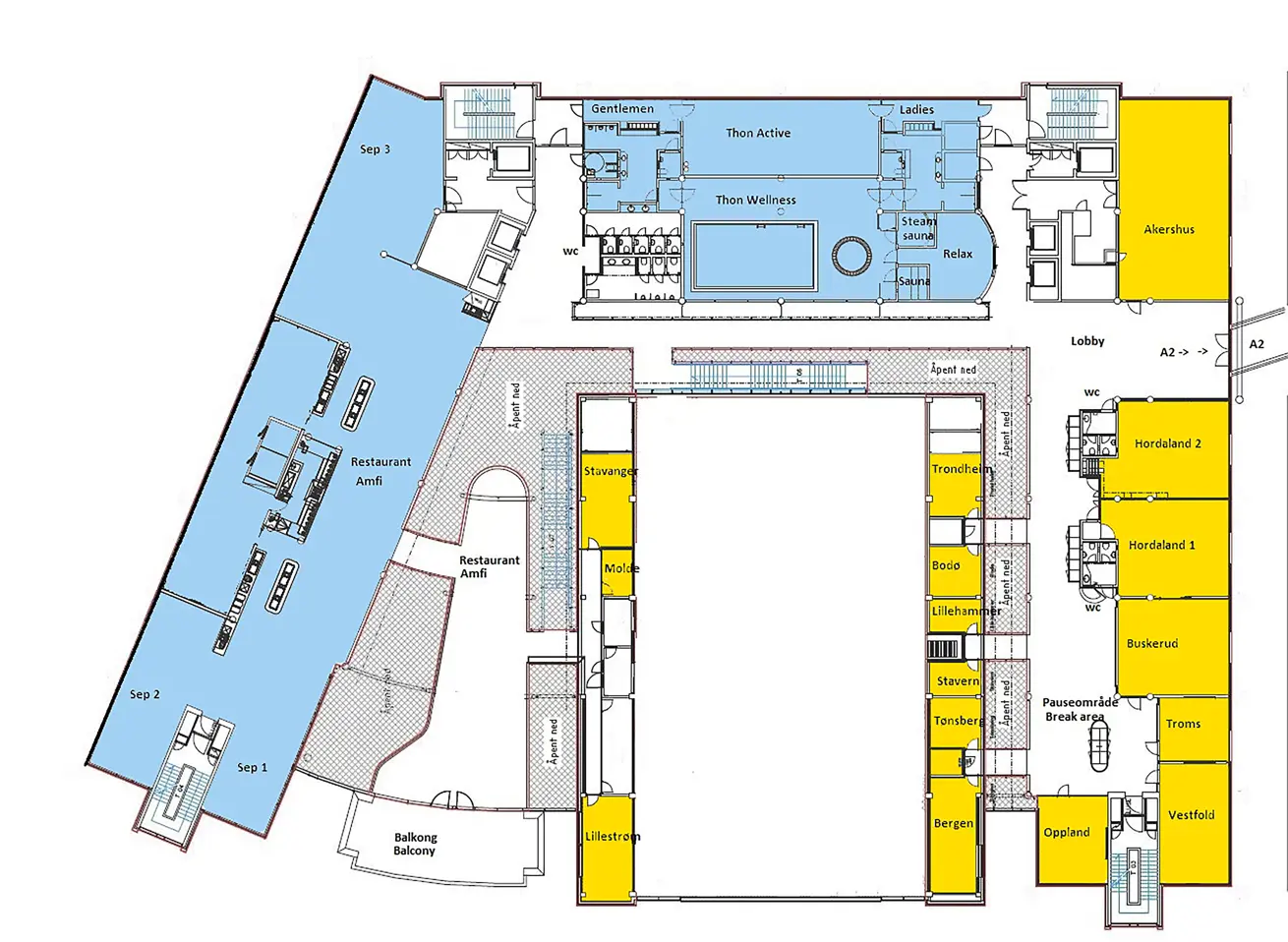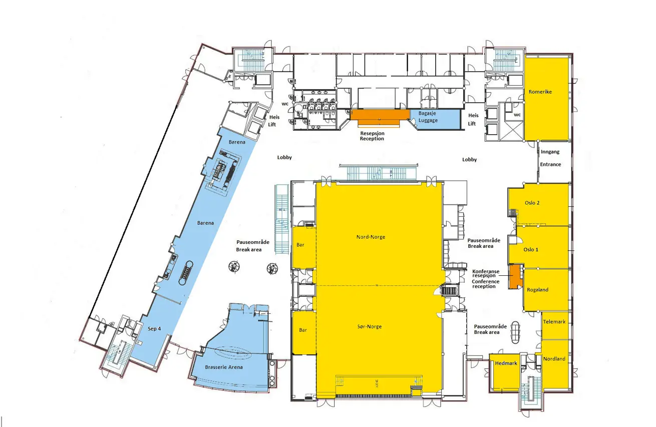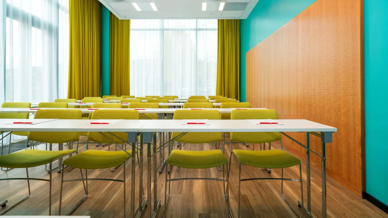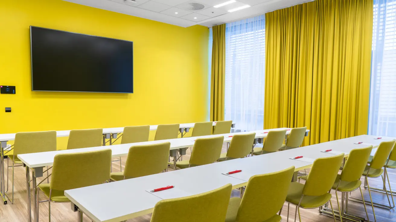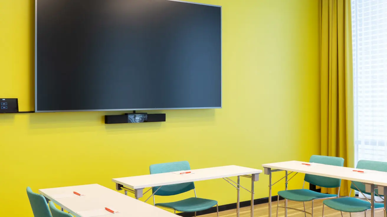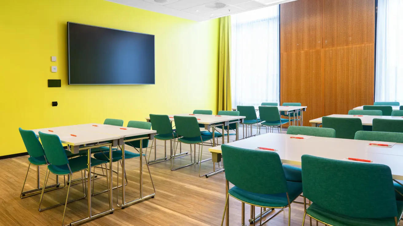 The Oslo meeting room can be divided into two equally sized rooms of 65 m2. Both have a 165/135" LED screen and large windows with natural daylight.