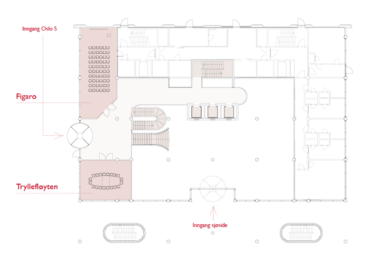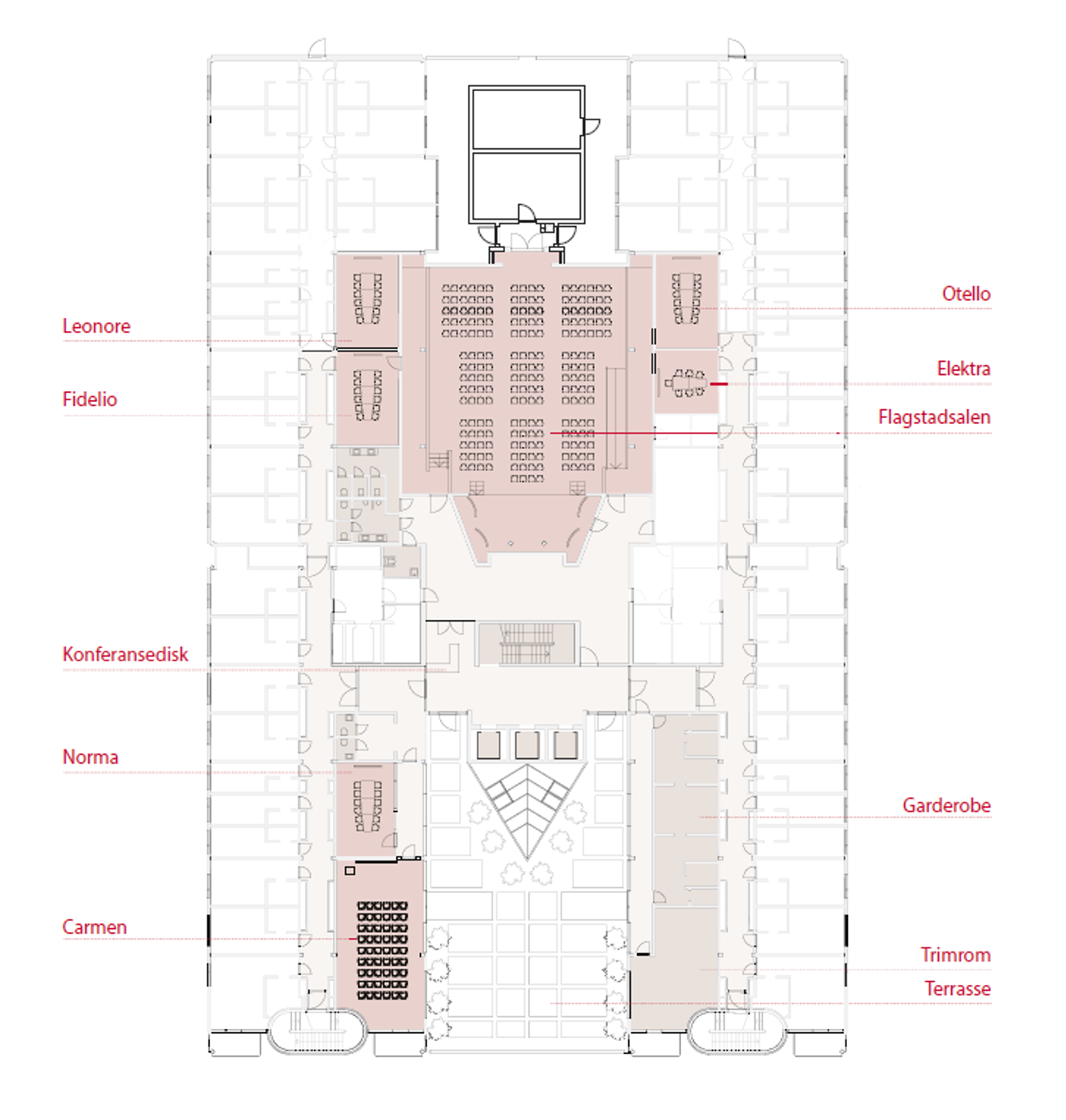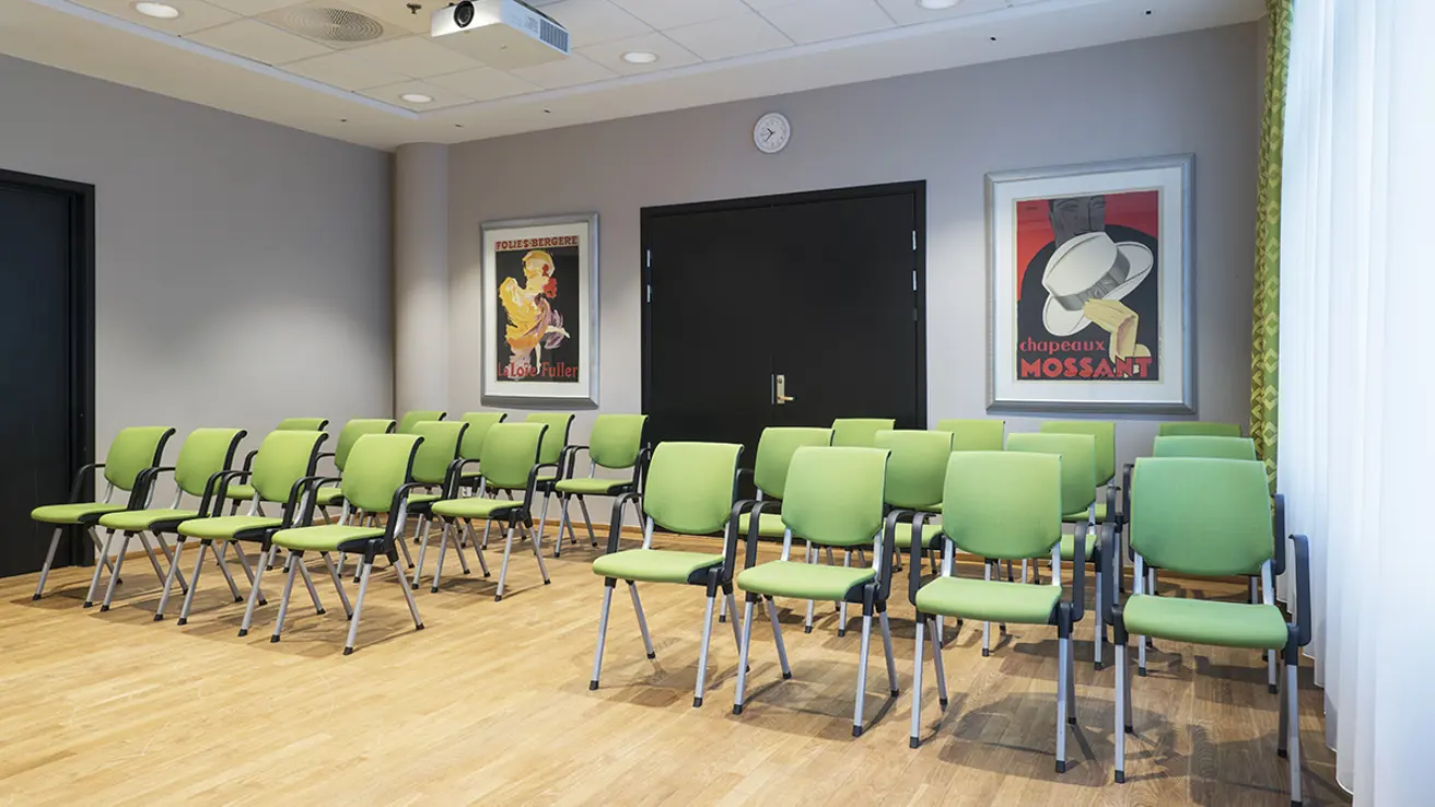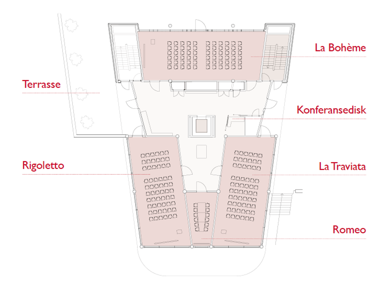 Fidelio has a fixed boardroom layout for 12. This meeting room has no window. The corridor leads to an airy terrace and mingling area.