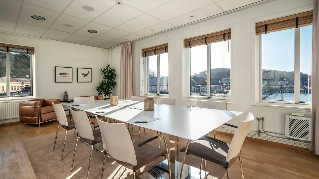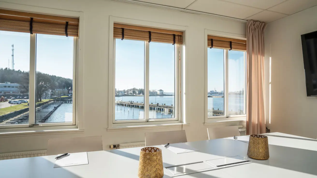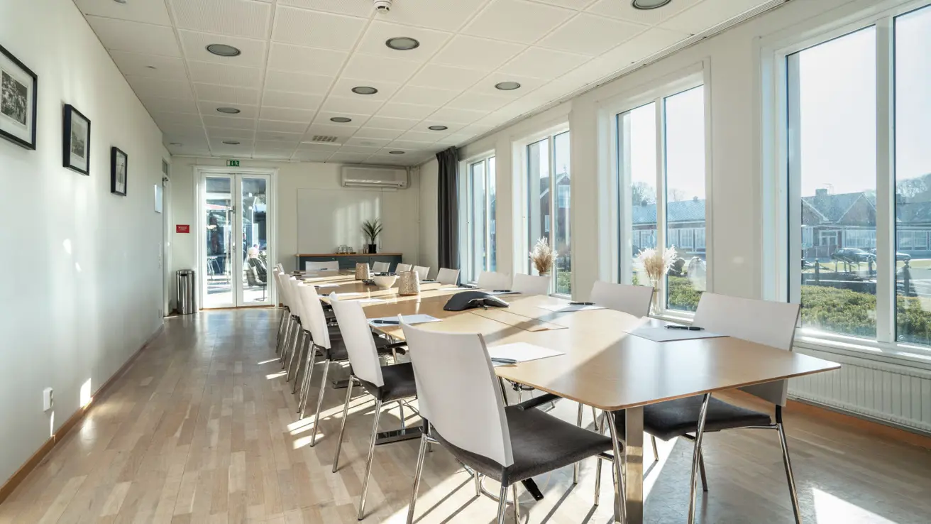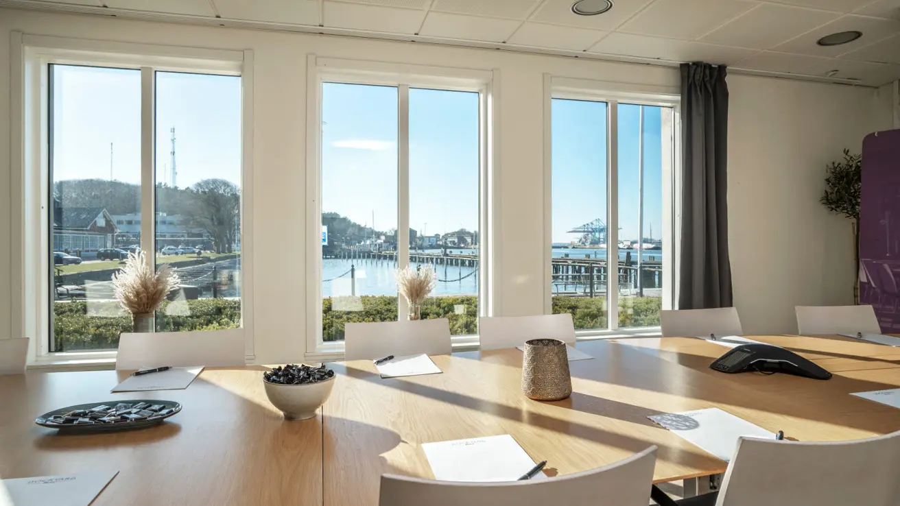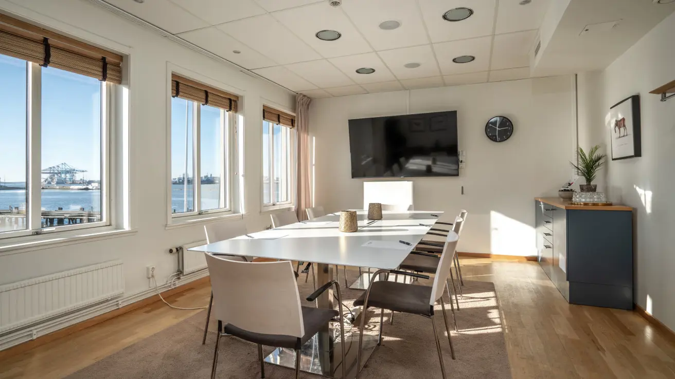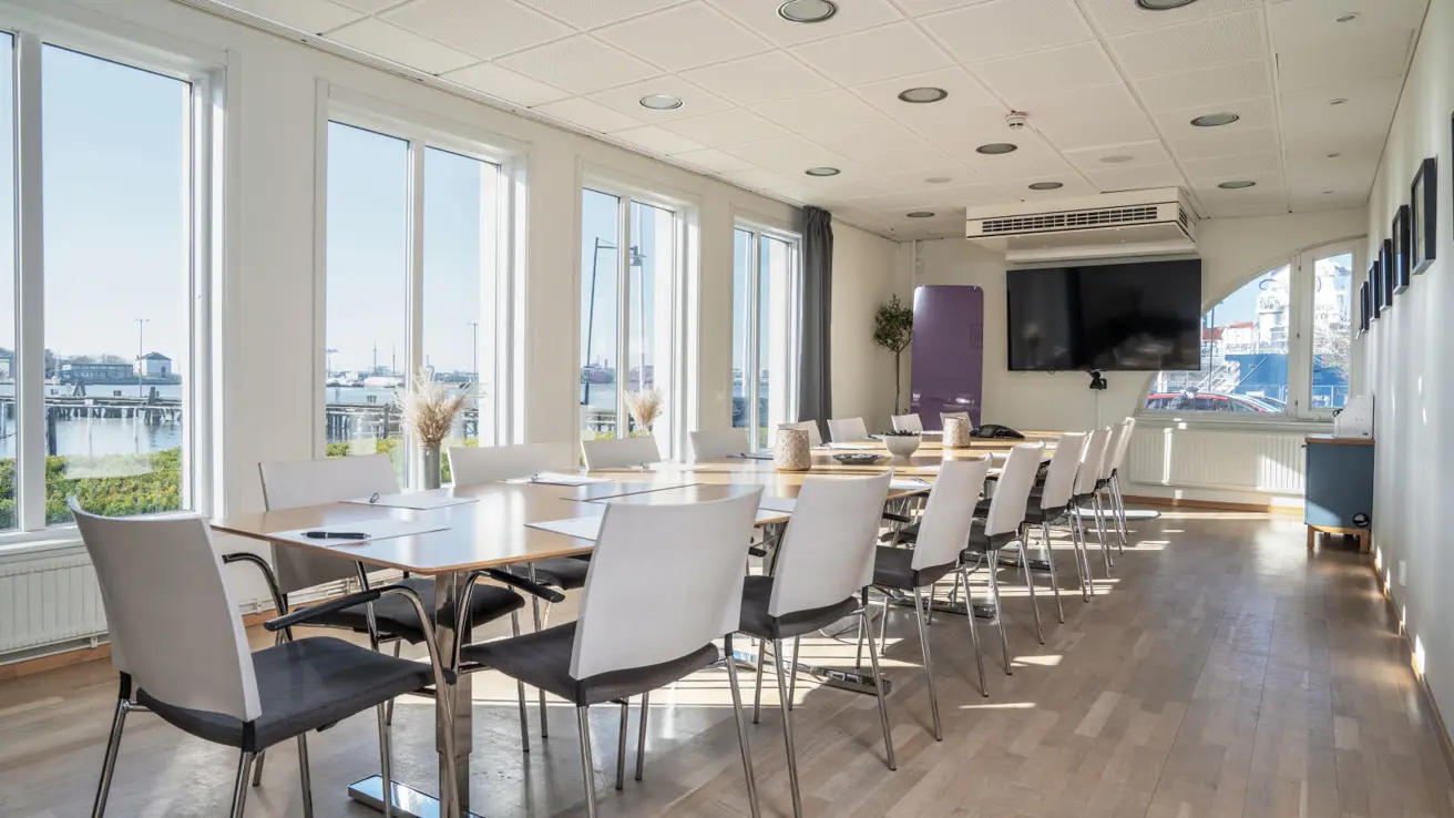 Light room with capacity for up to 12 people. The room has a fixed desk layout and is located on the second floor with a view of the harbour.