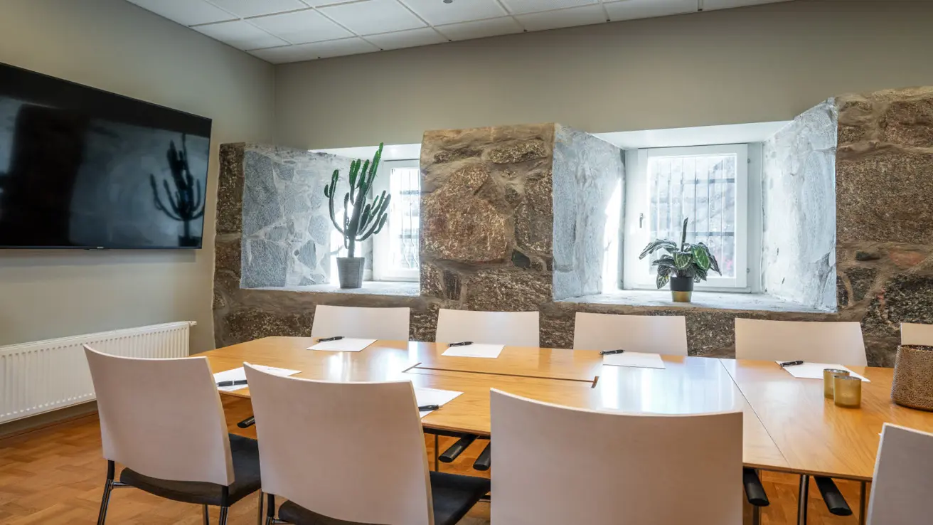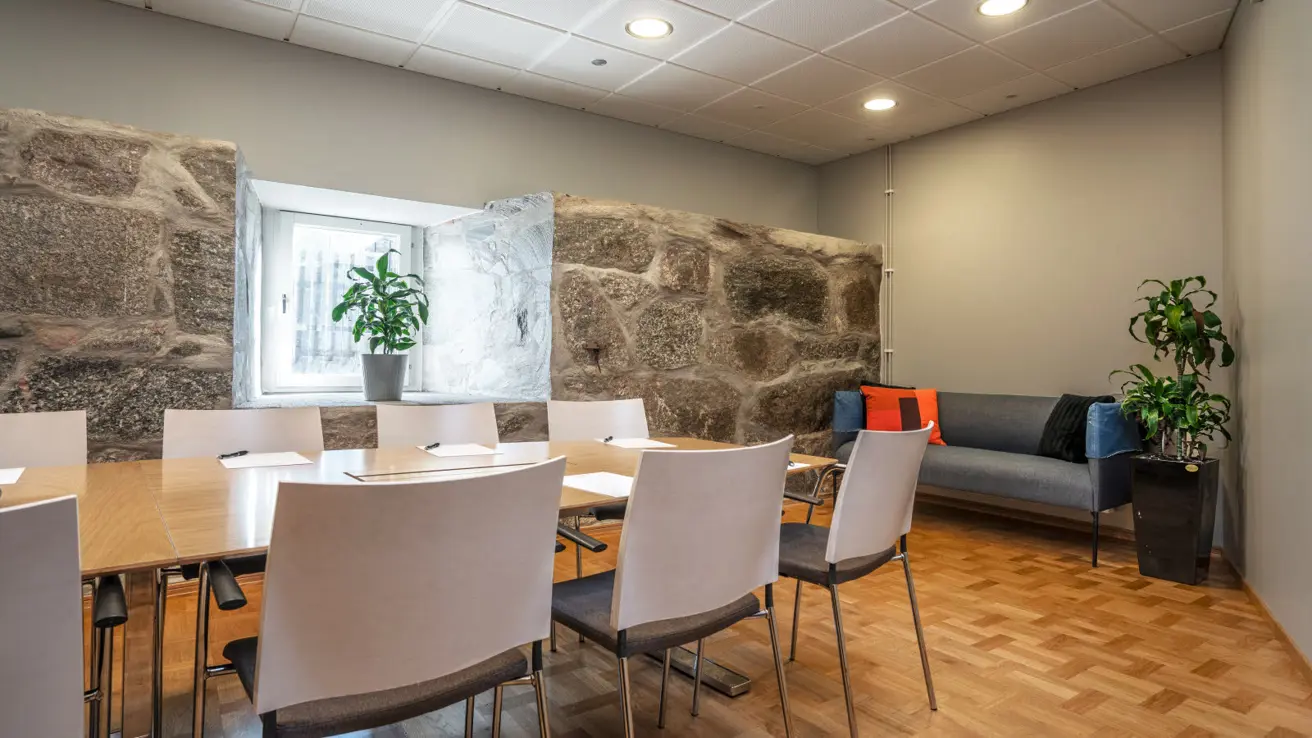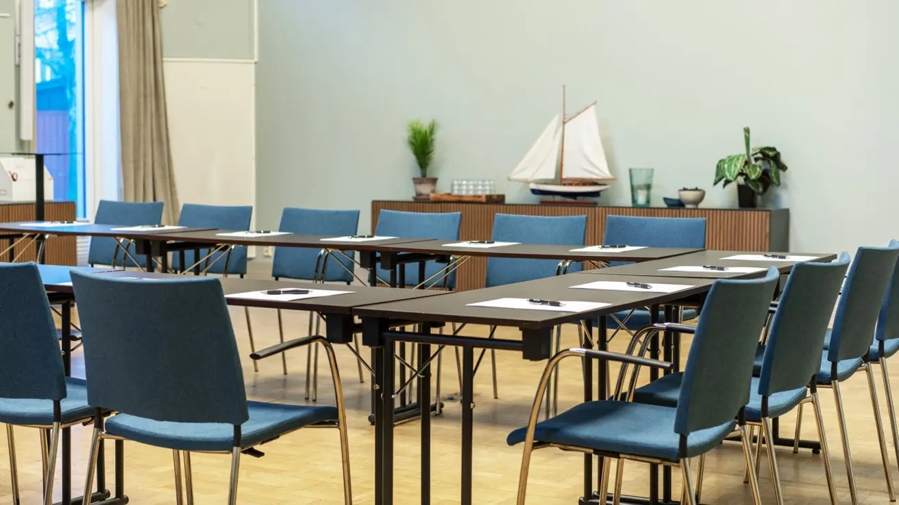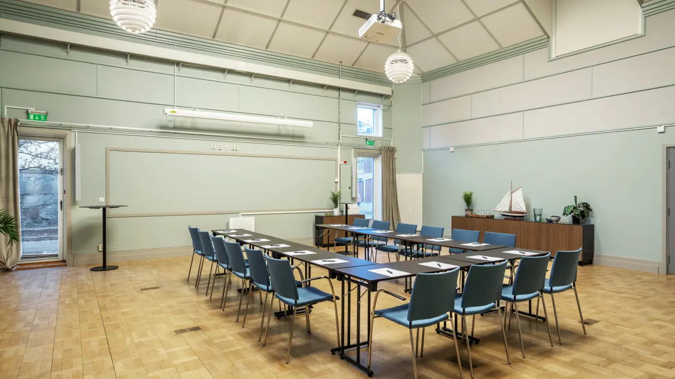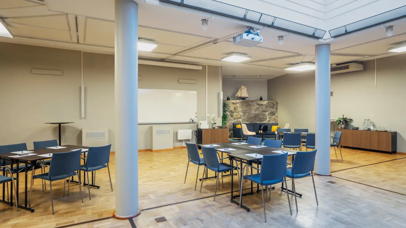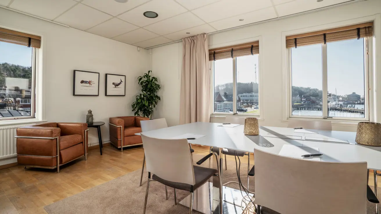 Light room with capacity for up to 12 people. The room has a fixed desk layout and is located on the second floor with a view of the harbour.