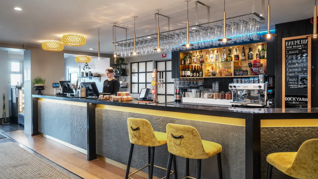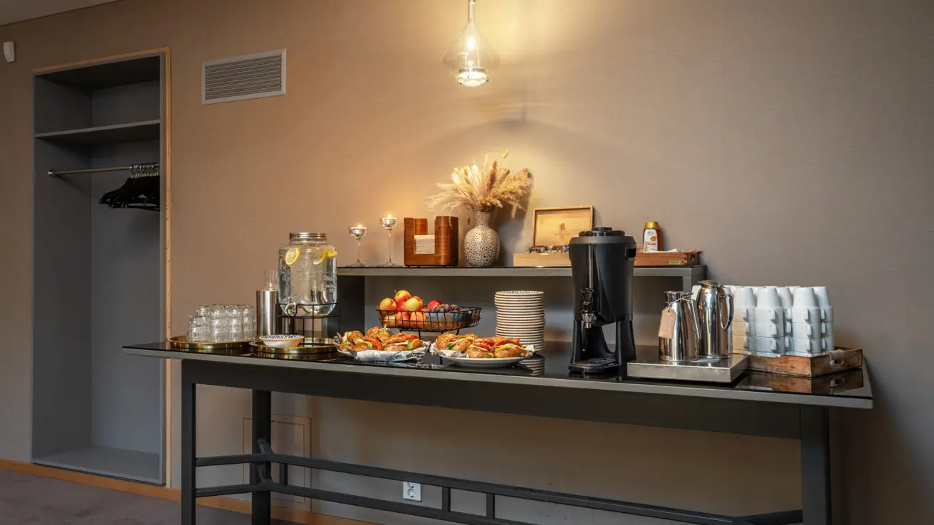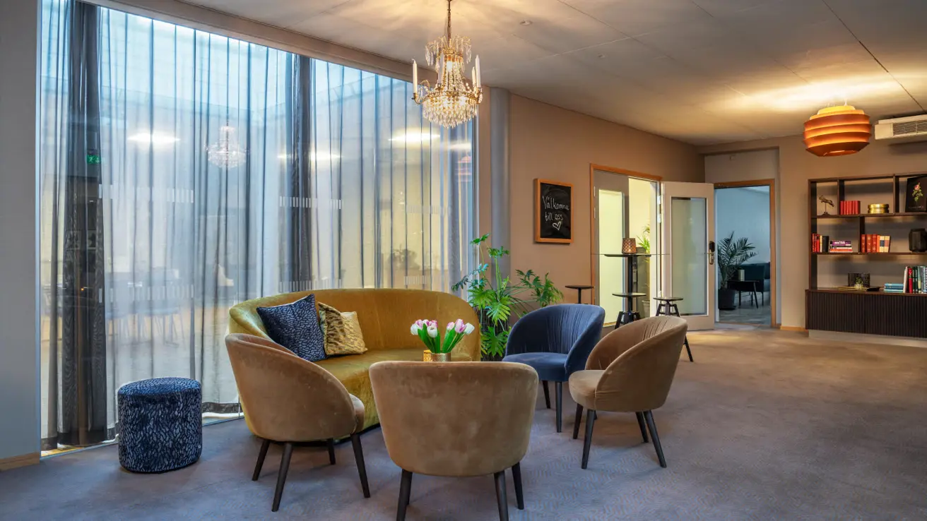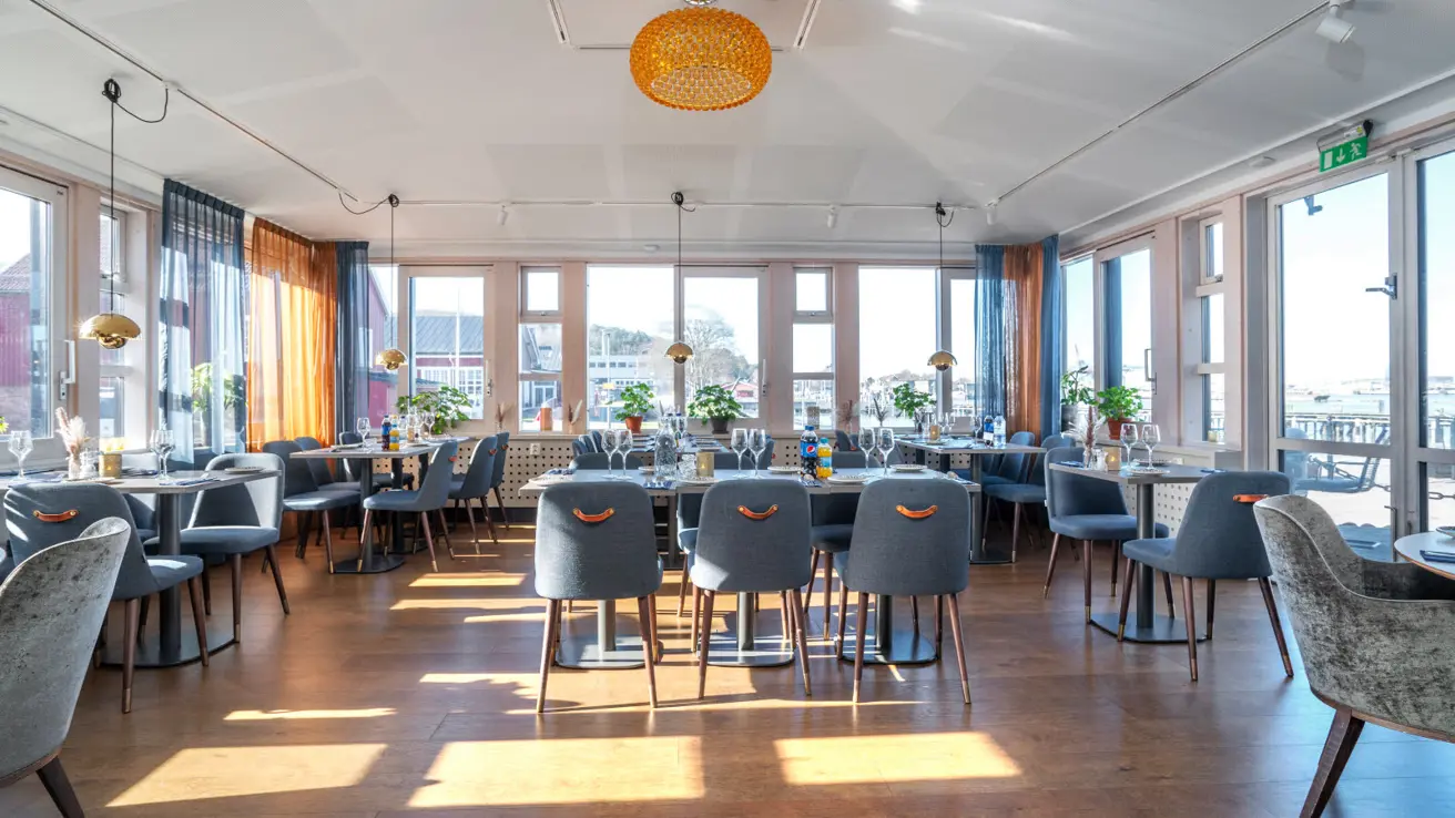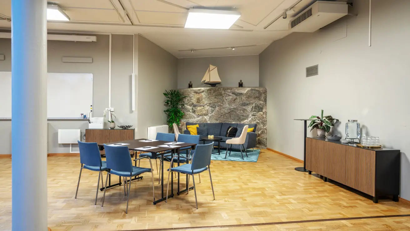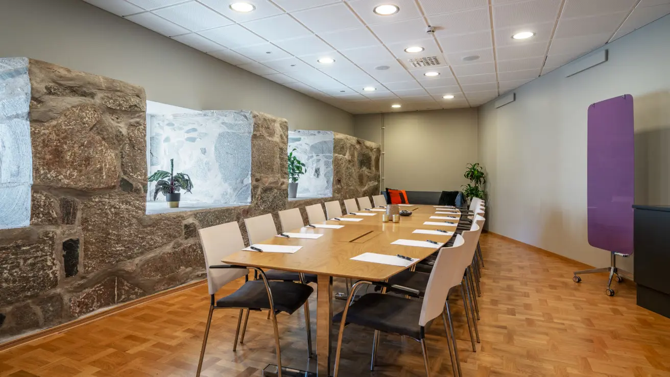 Light room with capacity for up to 12 people. The room has a fixed desk layout and is located on the second floor with a view of the harbour.