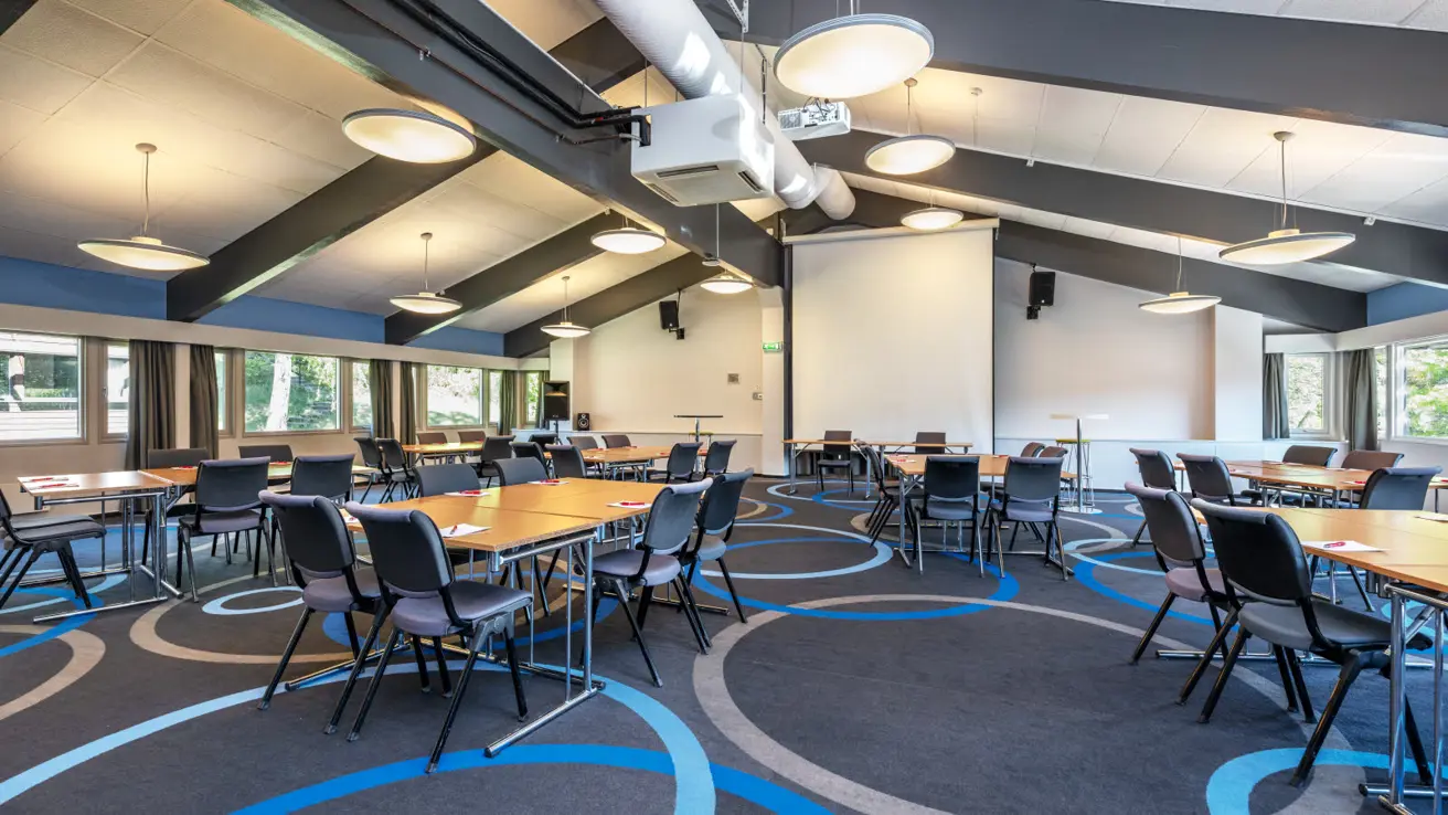 Konferansesal med gruppe bord, store taklamper, prosjektor og lerret og teppebelagt gulv.